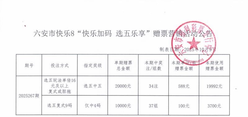 六安市快乐8“快乐加码 选五乐享”赠票营销活动公告