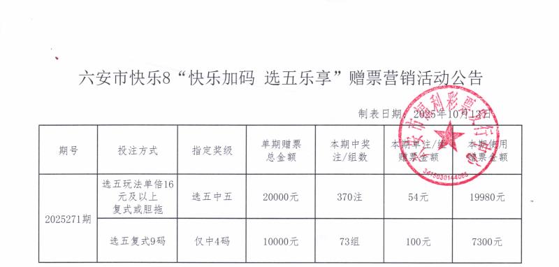 六安市快乐8“快乐加码 选五乐享”赠票营销活动公告