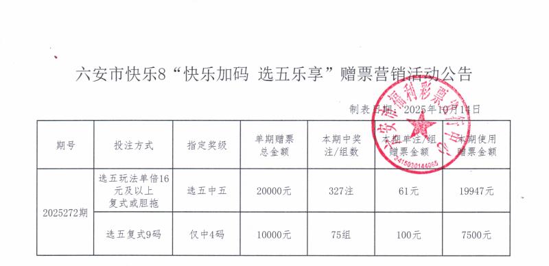 六安市快乐8“快乐加码 选五乐享”赠票营销活动公告