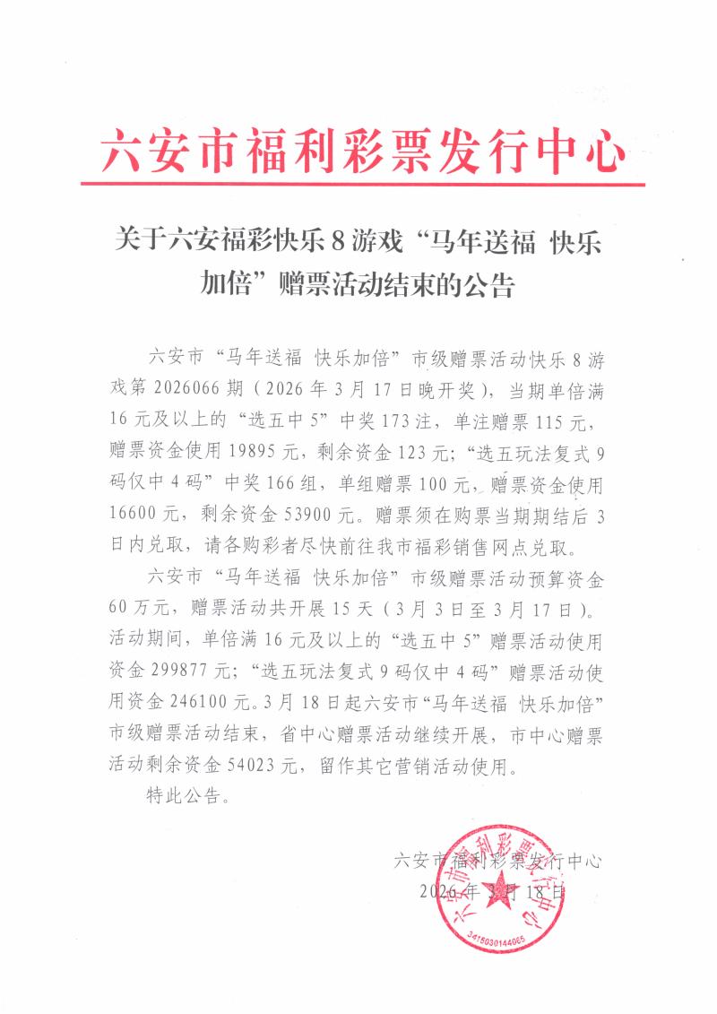 关于六安福彩快乐8游戏“马年送福 快乐加倍”赠票活动结束的公告