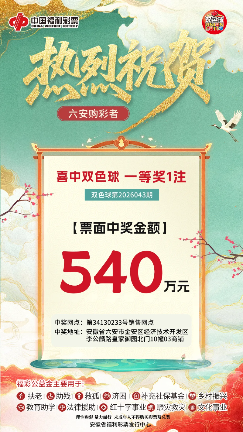 当晚,福彩双色球第2026043期开奖,六安市一购彩者喜中一等奖1注,奖金536.4612万元。票面中奖金额:540.3612万元。