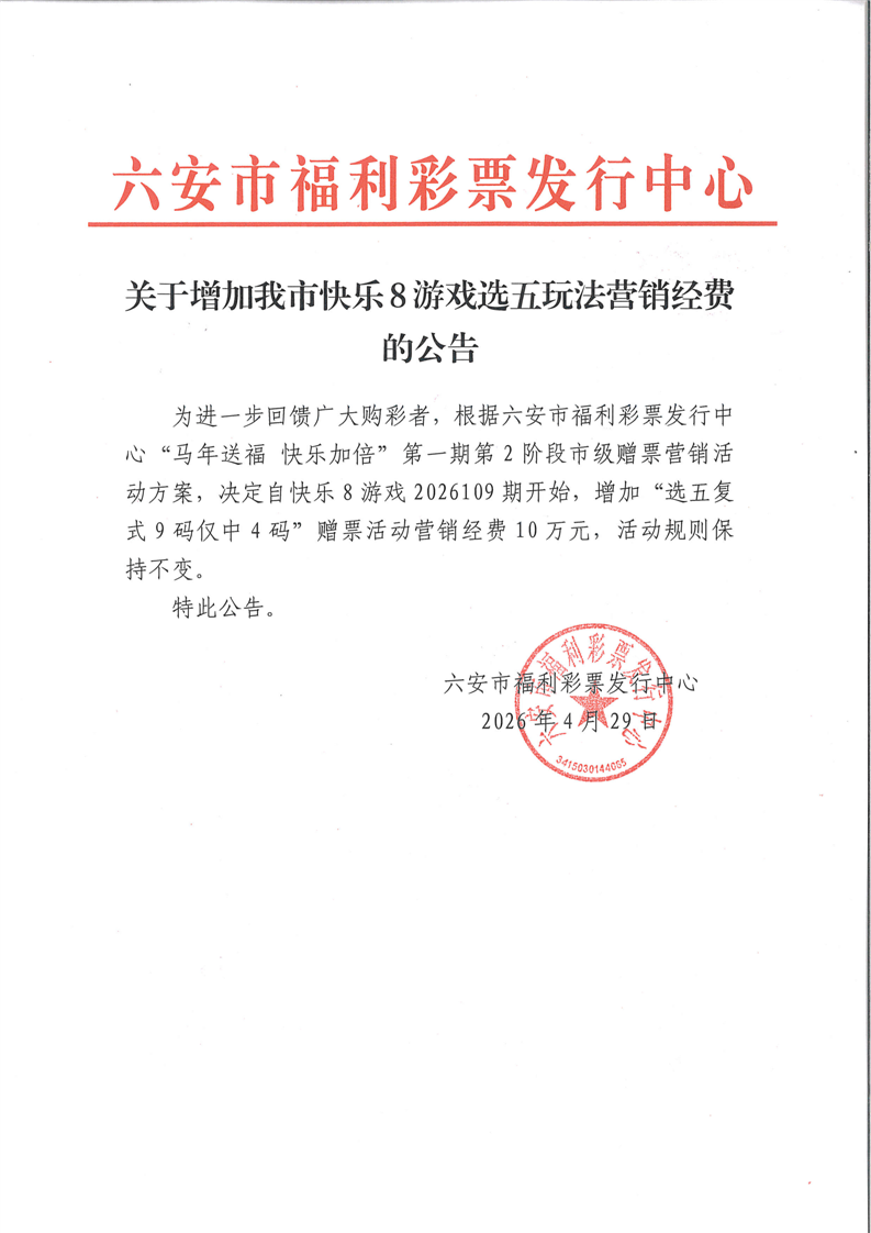 关于增加我市快乐8游戏选五玩法营销经费的公告