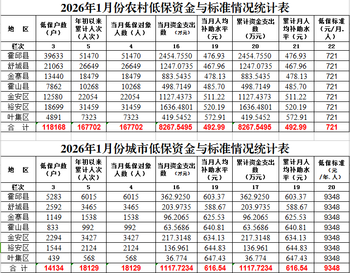六安市2026年1月份城乡低保资金与标准情况统计表