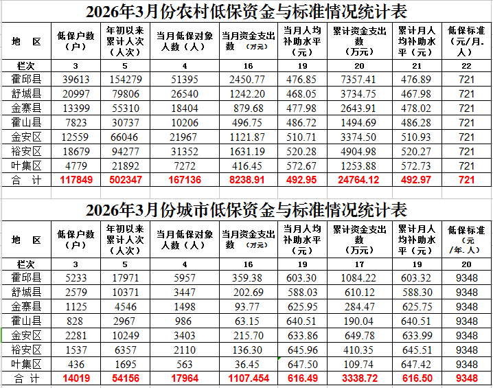 六安市2026年3月份城乡低保资金与标准情况统计表