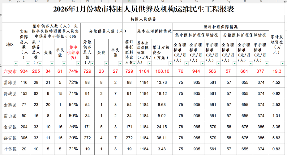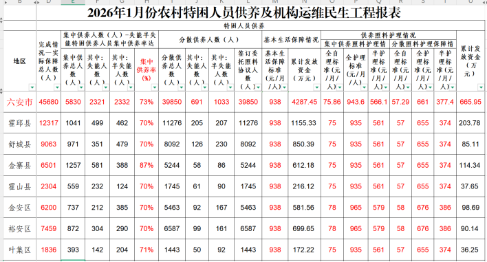六安市2026年1月份城乡特困供养资金使用情况统计表