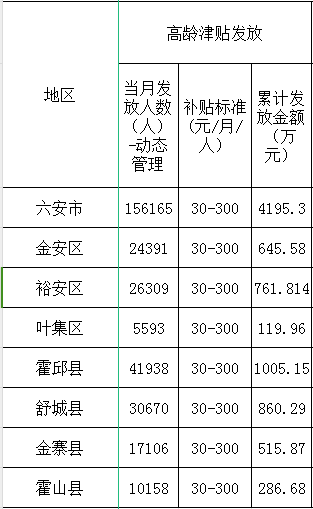 六安市2024年9月高龄津贴统计公示表
