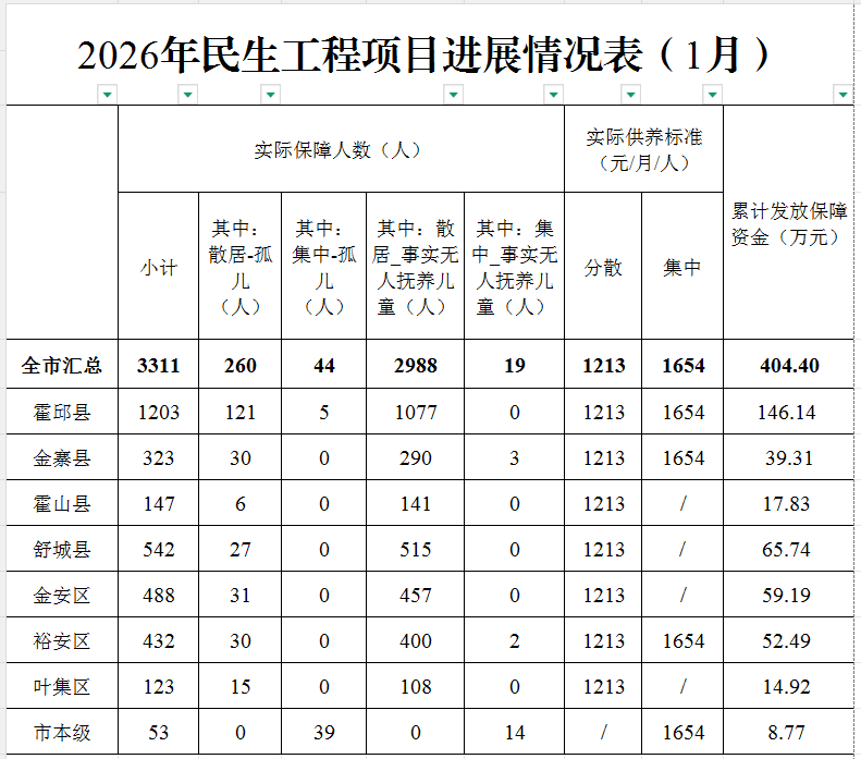 六安市民政局关于2026年1月份孤儿基本生活保障情况进展表