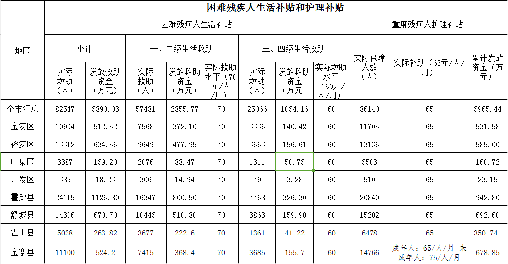 六安市民政局2022年1-7月份困难残疾人生活和护理补贴进展情况表