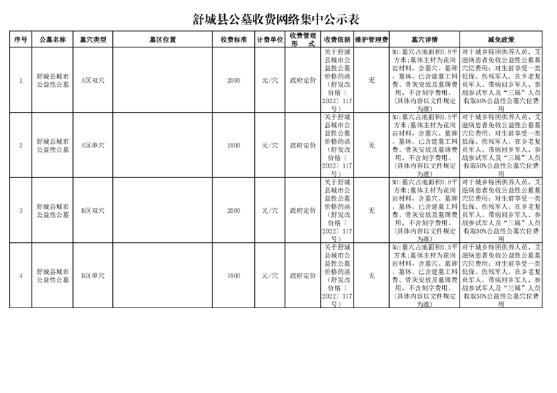 为认真贯彻落实安徽省市场监管局、民政厅等4部门关于加快推进殡葬服务机构收费网络集中公示的安排部署,进一步治理殡葬领域价格收费乱象,维护公开、公正、透明的殡葬领域收费秩序,切实保障群众合法权益,现将全市各地殡仪馆、经营性公墓、公益性公墓(骨灰堂)等殡葬服务机构收费集中公示如下。