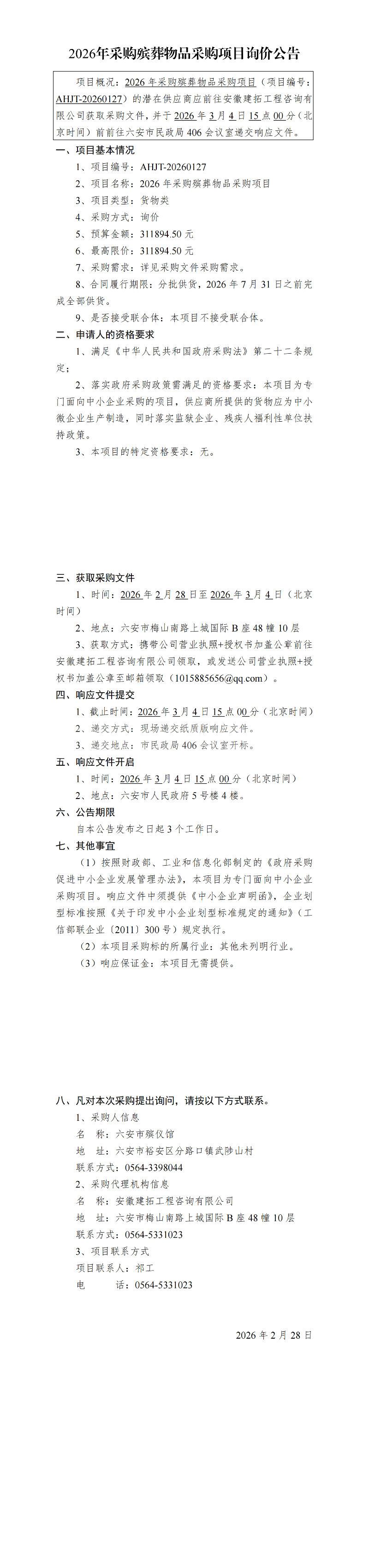 2026年采购殡葬物品采购项目询价公告
