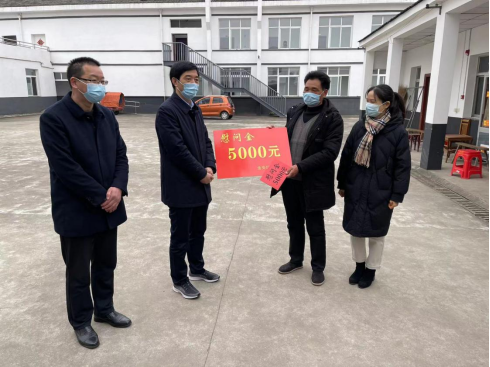图为金安区区委书记霍绍斌为养老机构送上慰问金